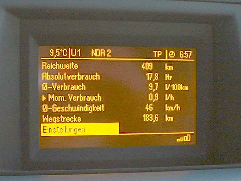 (z.B. Reichweite die noch mit dem Sprit gefahren werden kann, der Absolutverbrauch, der Durchschnittsverbrauch, den momentanen Verbrauch, die Durchschnittsgeschwindigkeit, die gefahrene Wegstrecke.)