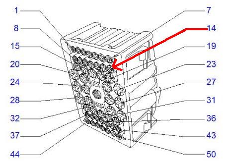 In diesem Stecker muss der Pin 14 auf Masse gelegt werden, also den Pin mit dem Minuspol der Batterie verbinden oder besser, einfach an einen Massepunkt der Karosserie anschliessen. (z.B. neben dem UEC ist einer oder zwischen Federbein-Auswölbung und Batterie)