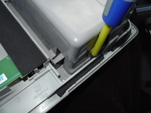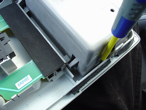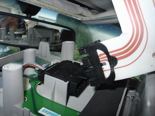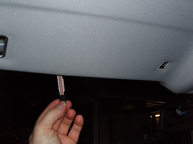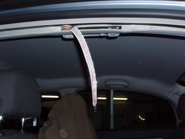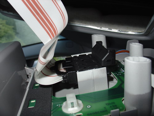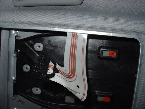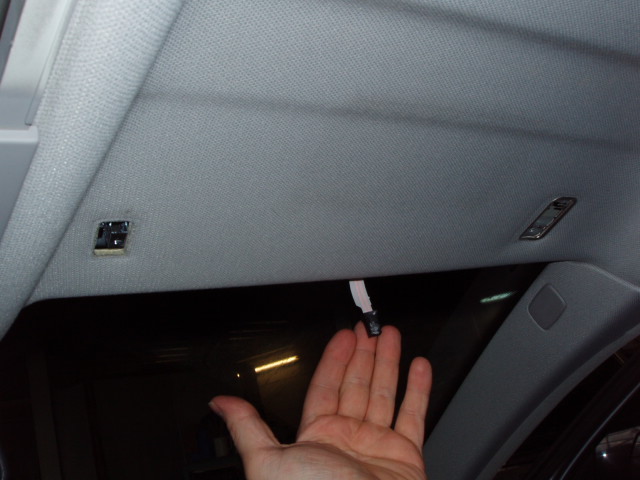 5. Leiterband mit Stecker (beschriftet-Center Dome) befindet sich auf der Fahrerseite zwischen der C- und B-Säule etwa 10 cm von der Aussenkante des Dachhimmel. Es ist mit einem Stoffklebeband bedeckt, dh. ihr müsst den Stecker mit Fingern fühlen.
