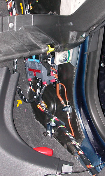 Das VDA-Kabel kommt oben links neben dem Airbag aus dem Nichts, zusammen mit den beiden orangenen Airbag-Kabeln. Es ist mit schwarzem Stoffband eingewickelt und liegt eng an dem Metallrahmen und ist unter der Abdeckung (siehe Pfeilrichtung und Punkt) an dem Metallrahmen befestigt.