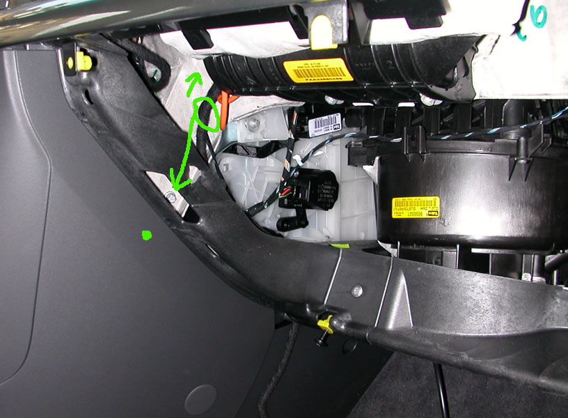 Zunaechst muss das Handschuhfach ausgebaut werden (unten zwei Torx20-Schrauben, wenn man es oeffnet oben drei Torx20-Schrauben) und an der rechten Seite im Fussraum Beifahrer muss die Verkleidung abmontiert werden (auch 2 Torx20-Schrauben).