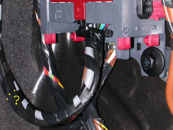 Das Antennenkabel befindet sich in dem Strang, wo auch das etwas dickere graue Radioantennenkabel mit drinne ist. Zusammen sind da diverse Kabel mit Isolierband umklebt. Das (Handy-)Antennenkabel ist eines der drei bzw. mehreren schwarzen Kabeln in dem Strang. Ab hier hab ich einen Fachmann werkeln lassen - ich vermute (!), dass das Antennenkabel anhand der Beschriftung auf der schwarzen Kabelisolierung zu identifizieren ist (sollte ein Koax-Kabel sein). Ob es ein Gegenstück dafür irgendwo in diesem Riesenstecker gibt weiß ich nicht, eine Moeglickeit ist aber wohl das Kabel durch zu schneiden und einen eigens gekauften F-Stecker dranzumontieren, um es dann mit der FSE zu verbinden.