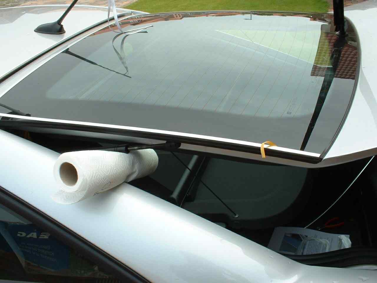 4. Nun die Heckklappe ein wenig öffnen, so das diese fast in der waagerechten steht und "allein schwebt". Damit diese auch dauerhaft "schweben bleibt", entweder zwischen die Heckklappe und die Karosse die Papierrolle klemmen oder jemanden bitten, die Heckklappe