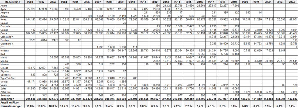 | Jahr | Anzahl der PKW absolut Neuzulassungen Deutschland | Marktanteil PKW Neuzlassungen nur Deutschland | Marktanteil PKW Neuzlassungen Europa (ohne Deutschland) |
