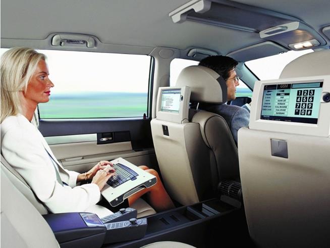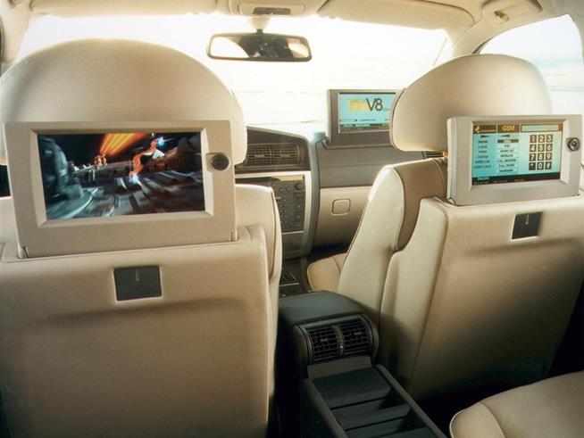 Für den Fondbereich ist eine umfassende Spaß- und Arbeitstechnik vorgesehen. Die Passagiere können den Blick auf je einen 9,5-Zoll-LCD-Bildschirm richten. Über Lautsprecher, die in die Kopfstützen integriert sind, können Kassetten oder CDs abgespielt werden. Auch der Empfang von Fernsehsendungen ist möglich. Genauso kann die Ausrüstung aber zum Arbeiten genutzt werden. Im V8.com finden sich neben Mobiltelefone auch Computer, mit denen im Internet gesurft werden kann. Das komplexe Multimedia-Angebot ist nicht über herkömmliche Kabel vernetzt, sondern über Lichtwellenleiter. Laserdioden setzen Daten und Steuerbefehle in Lichtimpulse um, die über Glasfaserkabel verteilt werden. Auf diese Weise soll verhindert werden, dass die elektromagnetischen Felder herkömmlicher Datenleitungen andere technischen Komponenten des Autos stören.
