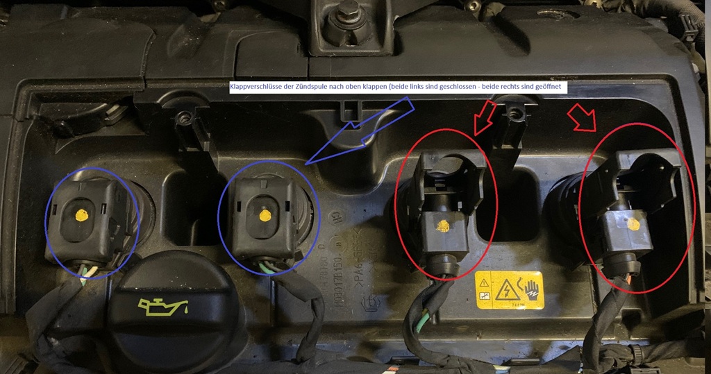 2. Zündkabel Klappverschlüsse um 90 Grad nach oben kippen (blau = im geschossenen Zustand, rot = im geöffneten Zustand). Im Anschluss können die Zündkabel noch oben vorsichtig von der Zündkerze abgezogen und noch oben herausgezogen werden.