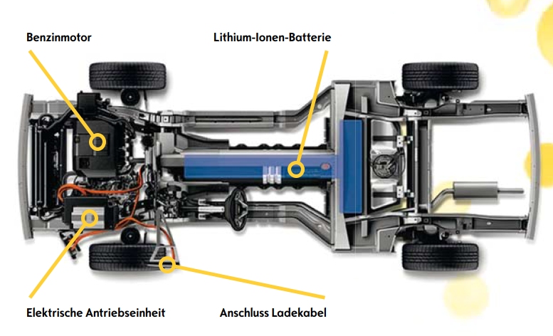 Ein Plug-in-Hybrid (PHEV) ist ein Fahrzeug mit Hybridantrieb, dessen Antriebsbatterie sowohl über seinen Verbrennungsmotor als auch extern über einen Stecker (englisch "to plug in", deutsch "einstöpseln, anschließen“) durch das Stromnetz aufgeladen werden kann. Der Plug-in hat einen größeren Akku als ein reines Hybridmodell und kann daher längere Strecken von ca 50 - 100 km voll elektrisch fahren.